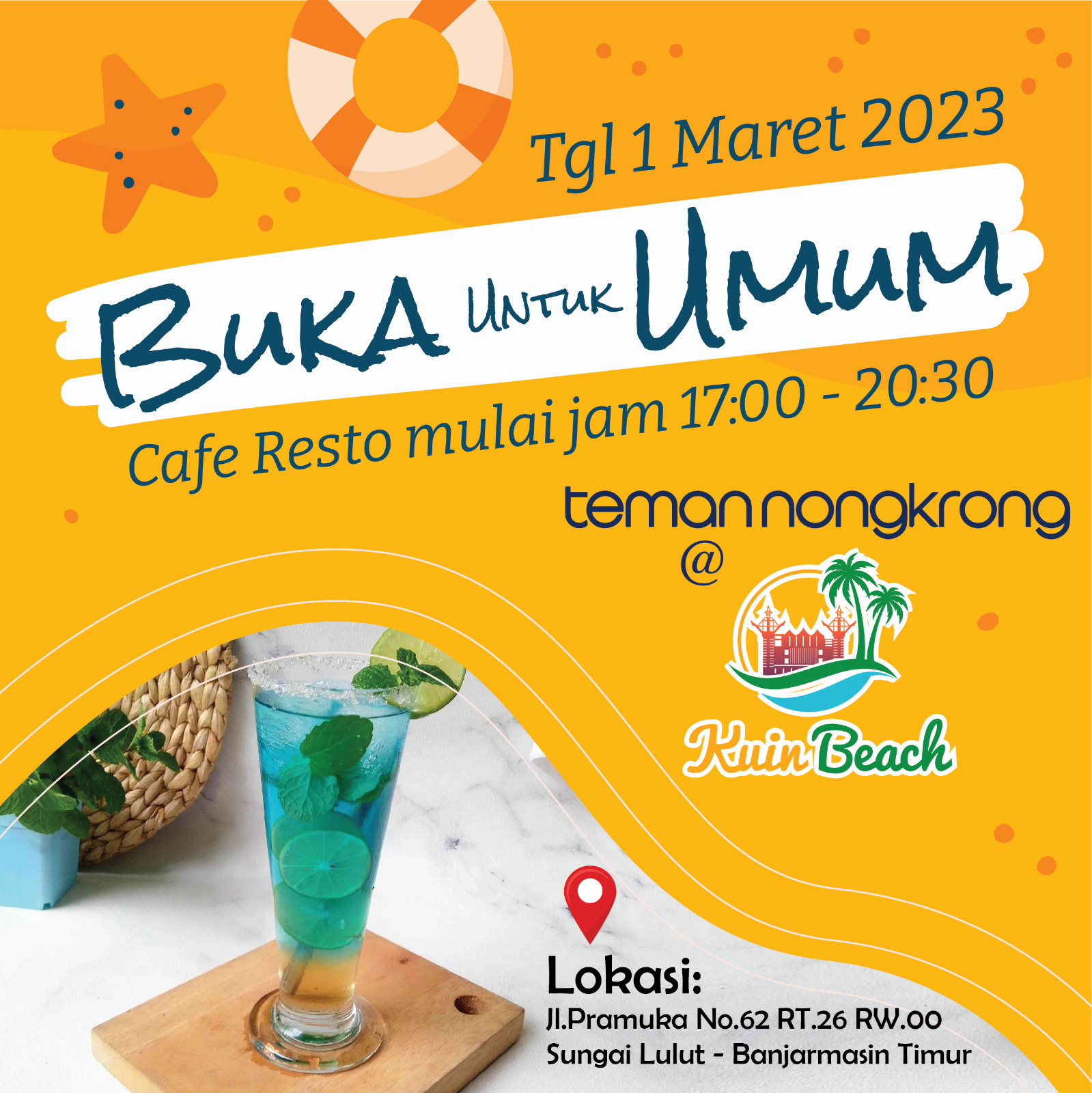 Mulai tanggal 1 Maret 2023 Cafe Resto TemanNongkrong @KuinBeach di BUKA UNTUK UMUM!!!